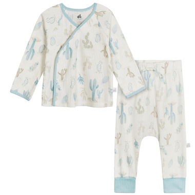 Each two piece set is made with soft cotton, a gentle and comfortable fabric thats perfect for newborns, babies, and toddlers. Just Born uses STANDARD 100 by OEKO-TEX certification on products tested in an independent laboratory against a list of more than 400 harmful substances, including PFAS. This outfit was designed with features that keep your life easy. Give this baby outfit as a thoughtful and practical baby shower gift. This pack includes one long sleeve side snap top and elastic waist pants both in a dusty blue cactus print.