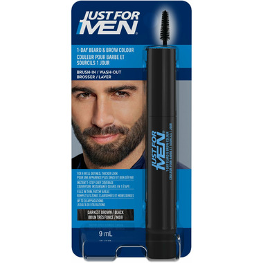 Just for Men 1-Day Beard & Brow Colour, is a brush-in/wash-out dye-free colour to temporarily cover greys and fill in thin, patchy areas for a thicker, well-defined look.