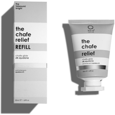For anyone prone to chafing. The Chafe Relief formulated with 6% Squalane, creates a protective barrier on the skin to help instantly soothe chafing irritation caused by heat and friction. Squalane mimics the skins natural oils, providing lasting moisture without an oily feel. With just a pea-sized amount, this concentrated balm glides on smoothly and dries down to a matte, powder-like finish. The 5-over-5 stainless steel applicator delivers precise application and a cooling effect to help calm redness.