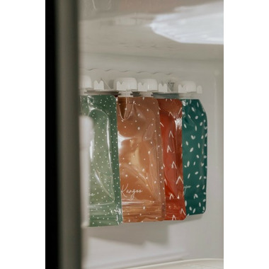 • Universal Holder for Reusable Pouches: The holder attaches easily to the inside walls of the refrigerator.