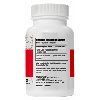Camu Camu 500mg (Fruit) Extract. Non-Medical Ingredients: alcohol, corn starch, microcrystalline cellulose, povidone, purified water.