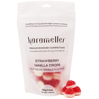 Satisfy your sweet cravings with Strawberry Vanilla Drops! These strawberry gummies sitting atop fluffy vanilla marshmallow and coated with sugar, are a delightful treat for your taste buds.