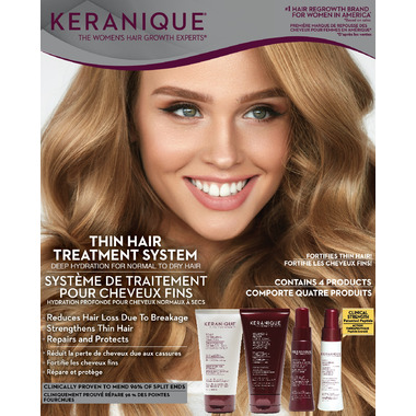 Keranique Thin Hair 4 Piece Treatment System gives deep hydration for normal to dry hair, reduces hair loss due to breakage and strengthens thin hair, repairs and protects.