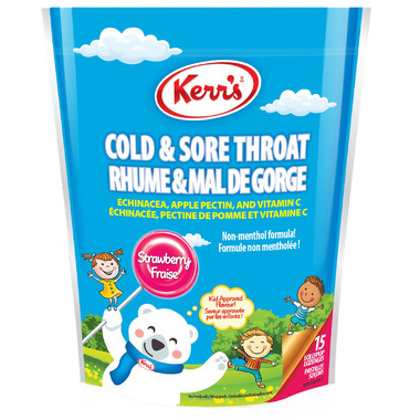 Kerr's Strawberry COLD & Sore Throat Lollypop Lozenges with Echinacea, Vitamin C and Apple Pectin for the relief of cold symptoms, to fight off infections and for the temporary relief of sore throat.