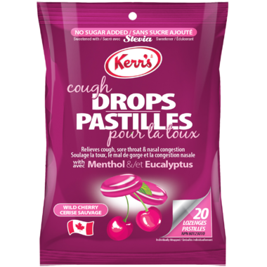 Kerr's Wild Cherry No Sugar Added Menthol Eucalyptus Cough Drops provide temporary relief of sore throat, nasal congestion and cough.