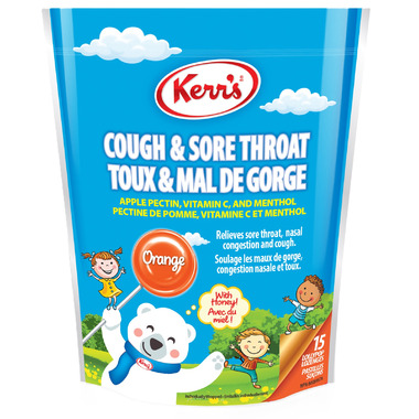 Kerr's Orange Menthol COUGH & Sore Throat Lollypop Lozenges with Menthol, Vitamin C and Apple Pectin for the relief of nasal congestion, cough, and for the temporary relief of sore throat.