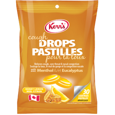 Kerr's Honey Lemon Menthol Eucalyptus Cough Drops provide temporary relief of sore throat, nasal congestion and cough.