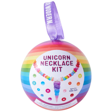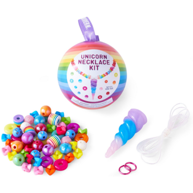 Create an enchanting unicorn necklace featuring an array of rainbow-hued beads. This Unicorn Necklace Kit comes packaged in a rainbow tin ball with a ribbon hanger, making it a great gift topper!