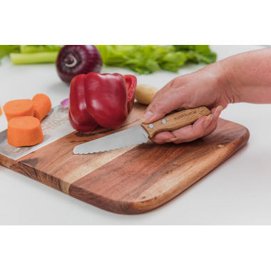 After many months of making sure Kiddikutter is bringing you a beautiful high quality wooden knife, here it is. KiddiKutter is designed for children to make prepping food easier and more enjoyable. Kiddikutter knives unique patented blade features rounded serrations that effectively cut through food, not skin. They work using a sawing or a chopping motion that maintains contact with the foods surface, reducing the effort required to slice, dice and chop. Made from a high-quality polished food safe stainless-steel blade that's designed to last for years, with an attractive beechwood handle thats easy to hold, KiddiKutter enhances independence and self-confidence.