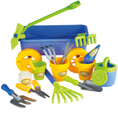 • Includes: working wagon, 9 garden tools, 4 flower pots, watering can, spray bottle