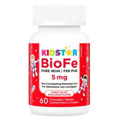 A daily iron supplement for children ages 3+ and adults in a Sweet Blast flavour with 5 mg of elemental iron per chewable tablet. BioFe™ Pure Iron does not cause constipation, upset stomach, or stained teeth. Zero sugar and sweetened with teeth-friendly xylitol.