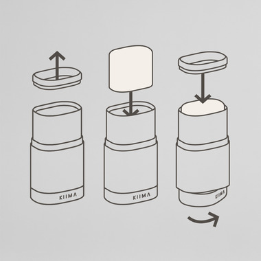 The KIIMA refillable deodorant applicator features rounded edges to ensure gentle application. Its unique, patented mechanism optimizes the refilling process and deodorant cycle. Compatible with KIIMA's partners' deodorant refills and the KIIMA DIY mold.