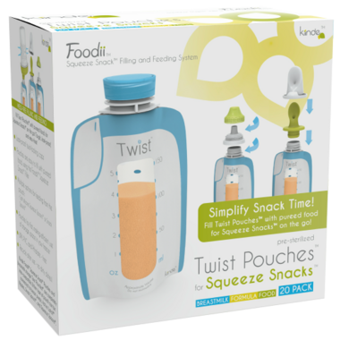 - Kiinde Foodii™ Squeeze Snack™ Pouches and breastmilk storage Twist Pouches™ are completely inter-compatible. Either type of pouch can be connected to breast pumps, Active Latch™ Nipples, Snack Spouts™, and Squeeze Spoons™.