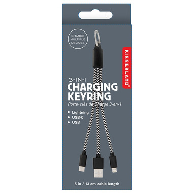 3 charging inputs: USB-C, USB, and Lightning. The keyring can charge from USB to Type C or USB to Lightning.