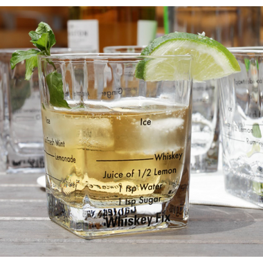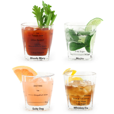 Become a bartender in no time with this set of 4 glasses from Kikkerland. Each glass features a different spirit and teaches you how to make four different cocktails.