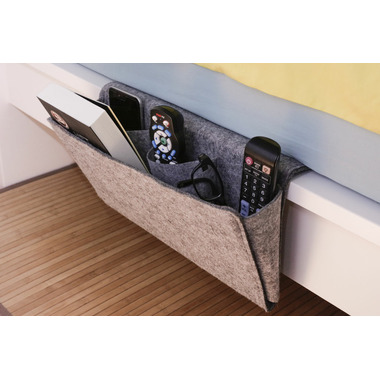 This Large soft and secure pocket is the perfect place to keep all your bedside essentials safe. Opening at the bottom allows for cable to go through to charge electronic devices. Fits all couches and beds. A winner of Kikkerland's 2014 Storage x Organization Design Project.