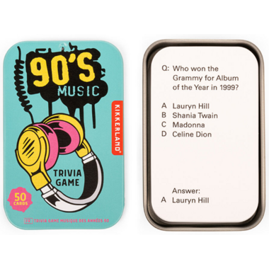 Bring back the nostalgia of 90s music with this set of 50 trivia questions, packed in a convenient tin for on-the-go fun! Perfect for parties or road trips.