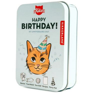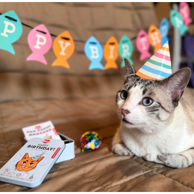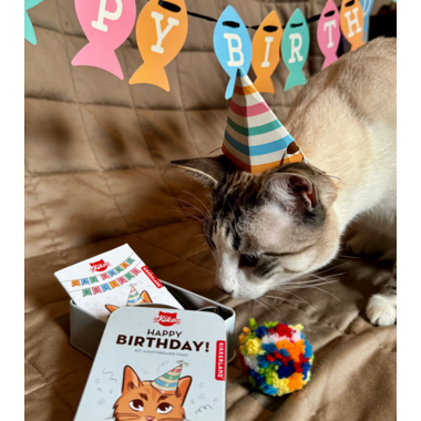 Celebrate your kitty companion in style. This celebration kit includes a banner, party hat, yarn ball, food safe stainless-steel fish treat mold, and a booklet - everything you need for a purrfect party.