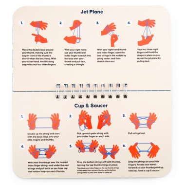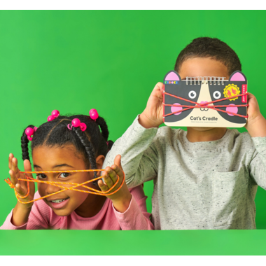 Kidoki Cats Cradle is a take on the traditional hand game played by children for generations. Wire-bound cat faced books with string to create various cats cradles, such as Cup and Saucer, Jet Plane, Star, Cats Whiskers, and Witches Broom.