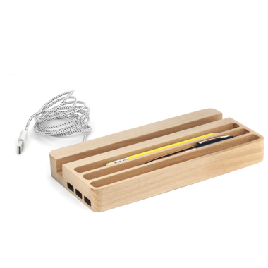 Organize your electronic and stationery items in this versatile wood USB hub. It has 2 USB ports and comes with a cotton braided USB cord.