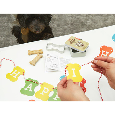 Celebrate your pooches' birthday! Items in the tin include a Dog Treat Recipe Book, Bone-Shaped Cookie Cutter, Birthday Hat, Happy Birthday! Banner & Confetti.