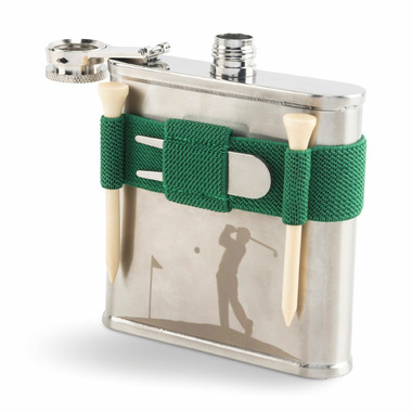 Fun and practical flask. Makes the perfect gift for any spirit-loving golf enthusiast. Stainless steel 6oz flask, with elastic strap that stores a divot tool and 2 golf tees.