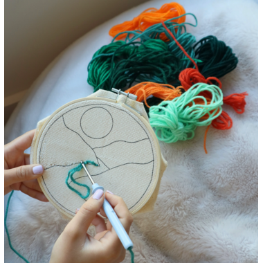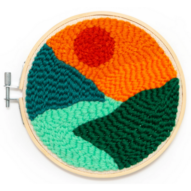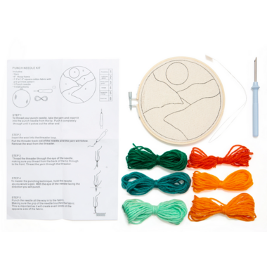 Learn the traditional handicraft of punch needle or "rug hooking" and create your very own miniature landscape tapestry. Kit comes with everything needed including: 1 adjustable bamboo hoop, 1 punch needle, 1 needle threader, 1 cotton cloth with printed template, and plenty of yarn to complete the design. Great for beginners!