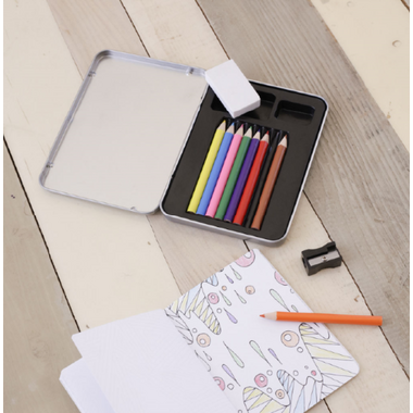 De-stress and stimulate your creativity just about anywhere with this amazing Mini Doodle Kit. The passport sized collectors storage tin is perfect for travel, so you can regain your center on an airplane, train, car or bus. Doodle book comes with 18 illustrations on acid free paper, and 8 color pencils.