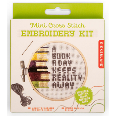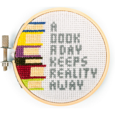 Relax at home orat work and on a mini-embroidery. Also a great kit for beginners! Includes: 3 bamboo hoop frame, 4.3 square canvas to stitch on, color threads, and 1 needle. Plus one pattern guide and helpful tips on getting started. Happy stitching! Pattern says "A book a day keeps reality away".