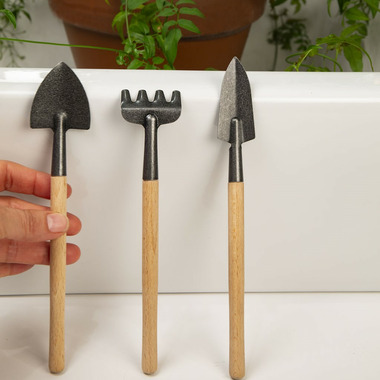 This set of 3 compact garden tools is perfect for indoor and small plant gardening. They take up minimal space and their stonewash finish and beechwood handles work with any decor!