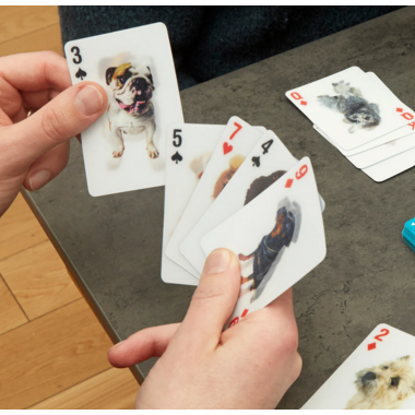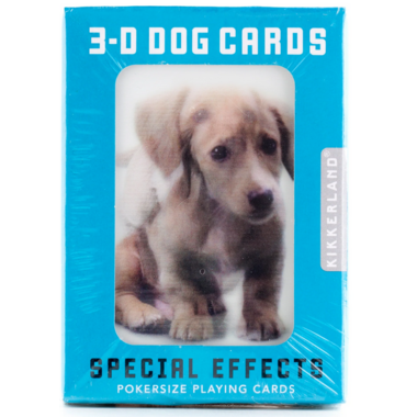 Lenticular poker size playing cards. Includes 52 different dog images and 2 cat jokers.