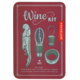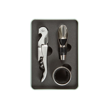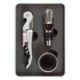 A complete set of wine tools in a sleek tin: corkscrew, pourer, stopper, and drip ring.food safe silicone, food safe PP stainless steel 420, silicone, polyester velvet, EVA Foam