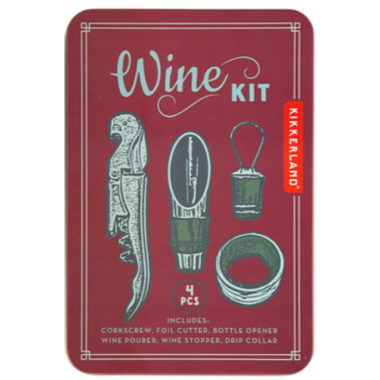 Dimensions:(tin) 6.25 x 4 x 0.75 (corkscrew) 4.75 x 0.75 x 0.5 (wine pourer) dia. 0.75 x 3 (wine stopper) dia. 0.25 x 2 (ring) dia. 1.5 x 0.75
