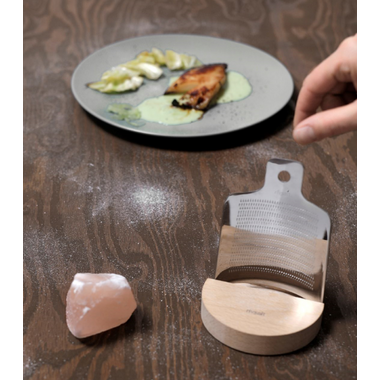 Includes a grater, a beechwood base and natural pink 6-7 ounce Himalayan salt rock. When not in use the stainless steel grater fits tidily back onto the handsome beechwood base.