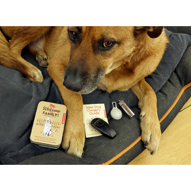 Your new dog welcoming kit tin comes with identification charm, dog whistle, clicker, collar light and new dog care guide!
