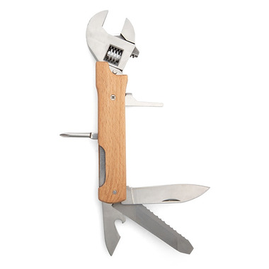 Be prepared for anything with this handy wrench multi-tool. Includes 8 tools: adjustable wrench, flat head screwdriver, bottle opener, reamer, saw, file, knife and phillips head screwdriver.