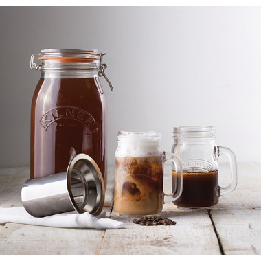 The Kilner Cold Brew Coffee Set extracts all of the delicious flavours from ground coffee by steeping in cold water. Ready in as little as 12 hours, this set includes a stainless steel coffee filter and muslin squares for an extra smooth coffee, as well as handled jars.