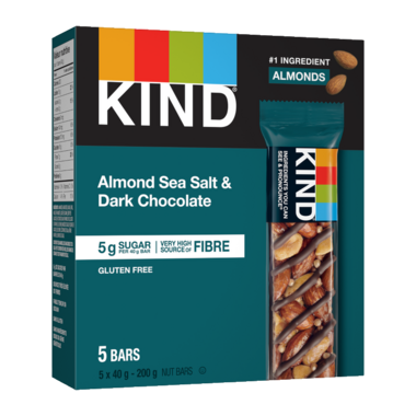 Made with almond, sea salt and dark chocolate, these Kind Bars are a good source of fibre and gluten free!