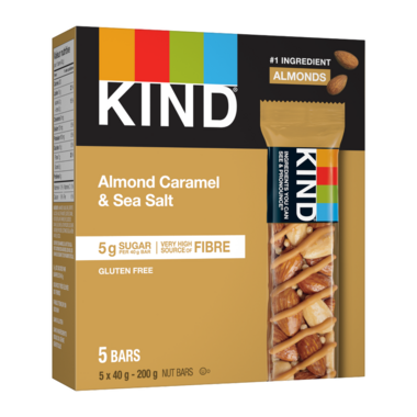 Made with almond, caramel and sea salt, these Kind Bars are a good source of fibre and gluten free!