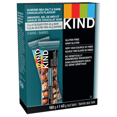 Dark Chocolate Nuts & Sea Salt is a sweet and salty blend of almonds, peanuts, and walnuts drizzled in chocolate with a touch of sea salt. These KIND® bars are a source of fibre and gluten free, which makes this a snack that’s easy to recognize, pronounce and enjoy. What’s not to love?