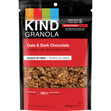 KIND HEALTHY GRAINS Dark Chocolate granola clusters are an all-in-one, convenient, hand-to-mouth healthy, protein packed snack mix. These wholesome clusters have 10 grams of protein and 34 grams of whole grains per serving, making this a satisfying healthy snack.