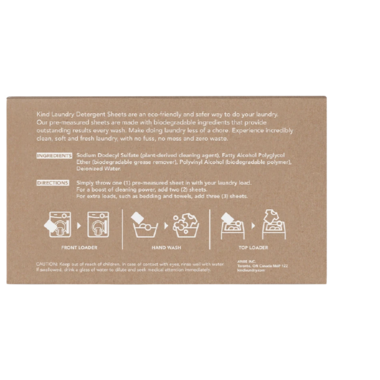 Kind Laundry Detergent Sheets is a zero-waste and safer laundry alternative to your traditional laundry detergents that come in heavy bulky plastic jugs and contain up to 20+ toxic ingredients. The pre-measured sheets are made with only 4 simple ingredients but still packs strong cleaning power (it's the cleanest on the market!). Just simply throw in the desired amount of sheets and experience super clean, soft and fresh load of laundry...mess-free, every time. Guaranteed!