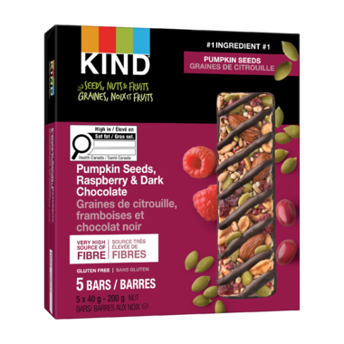 KIND Seeds, Nuts & Fruits Bar Pumpkin Seeds, Raspberry & Dark Chocolate is a very high source of fibre and gluten free.