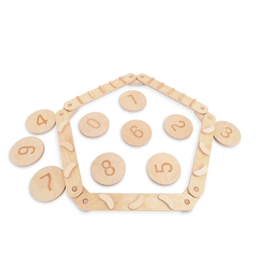 - 5 Double-sided reversible planks with 10 numbered disks allow for multiple configurations.