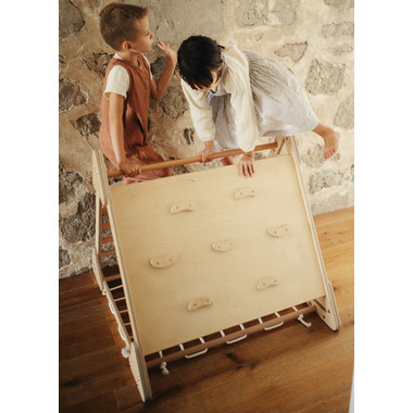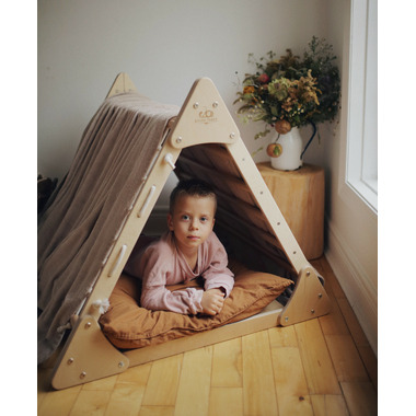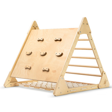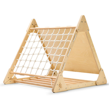 The LARGE Pikler Triple Climber Triangle features 3 different sides for climbing: one with ropes, another with wooden stepping blocks, and a third with dowels. Crafted using responsibly-sourced birch plywood and beech wood, it's a wonderful sustainable option for mobile little ones exploring their adventurous side. Through physical developmental play with the Pikler system, children gain muscular and cardiovascular strength, build self-esteem, improve gross motor skills and explore their imagination simultaneously.