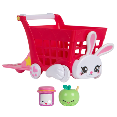 Come inside Rainbow Kindi, a place where every day is about playing and making friends, as the Kindi comes to life! Rainbow Kindi is full of playful personalities like me, the Kindi Fun Shopping Cart! Place one of the Kindi Kids on my back and fill me up with the happiest Shopkins around! I'm the perfect size for all the Kindi Kids, so that they can ride me around Rainbow Kindi! Push me along and see me come to life! I'll make you giggle as you see my bunny ears bobble and paws walk! I come with 2 Exclusive Shopkins, a cute Apple Shopkin and D'lish Jar of Jam! Ride me over to the Rainbow Kindi's Supermarket Playmat and zoom me along the pathways! There is so much to do and check out! Come and share a cart load of cuteness to discover the wonderful world of Kindi Kids!