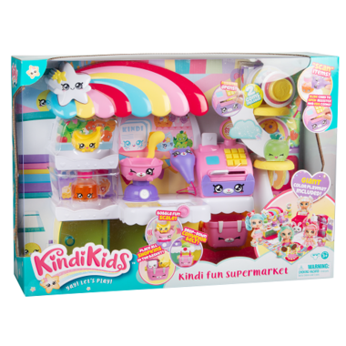 Come inside Rainbow Kindi, a place where every day is about playing and making friends, as the Kindi comes to life! Rainbow Kindi is full of playful personalities like me, the Kindi Fun Supermarket! Kindi Kids love shopping and playing with me, with the cutest things to buy and activities to try! Pop a Shopkin on my scales, and see it bobble and sway as they get weighed! Checkout your Shopkins on my Kitty scanner, then open the register by sliding my little card to pop in the coins! Place your Shopkins on my "Shop 'n' Drop" conveyer belt and when you're ready to check out, press the button and see them drop down into the shopping basket! There is even a spot for Shopkins to chill in my Cold Storage Area! With so much to do, I am the "One Stop Fun Shop!". Included with the Kindi Fun Supermarket is a GIANT color playmat that opens out to a huge kindergarten Supermarket corner area! There is a place for all your Kindi playsets on it, to make a magical Kindi! All the Kindi Kids will love to explore and play there! Included with the Supermarket are a Bananas Shopkin and Magic OJ Shopkin that are exclusive to this playset!