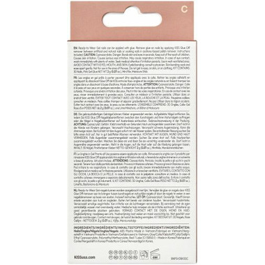 REMOVAL: Trim and file surface to disrupt protective top coat. Use KISS Glue Off as directed (sold separately) or soak nails in acetone polish remover until soft. Wipe off softened nails & glue. Do not force or pull nails off.