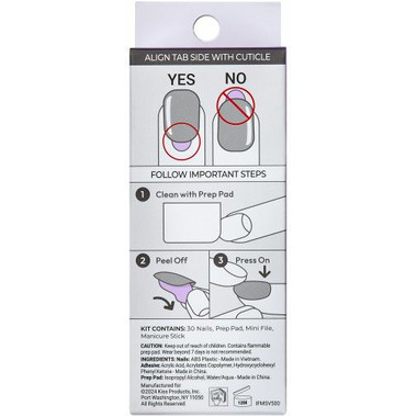 Nails: ABS Plastic Adhesive: Acrylic Acid, Acrylates Copolymer, Hydroxy Cyclohexyl Phenyl Ketone Prep Pad: Isopropyl Alcohol, Water/Aqua