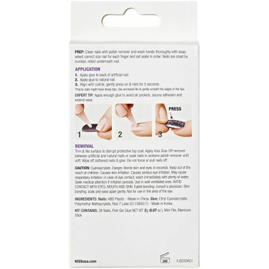 REMOVAL: Trim & file surface to disrupt protective top coat. Soak nails in acetone polish remover until soft. Wipe off softened nails & glue. Do not force or pull nails off. For glitter nails: Glitter may cause an uneven edge; use enclosed file to gently file smooth.
